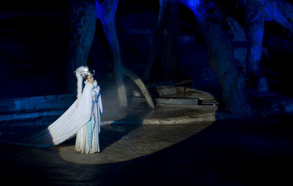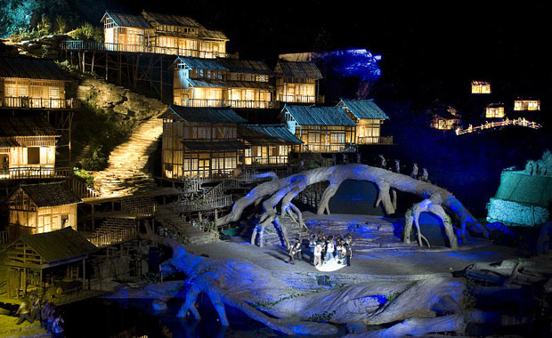 劇中的中心舞臺(tái)搭建在溪谷之上,望之就如一顆橫臥的古樹浮于涓涓溪流之上,與周圍的天然山石完美相融。舞臺(tái)面積總10000平方米,不僅是目前全球最大的演出舞臺(tái),而且全部采用玻璃鋼設(shè)計(jì),燈光照射下通體透亮、色彩變換,營造出一幕幕令人驚異的奇幻場景。