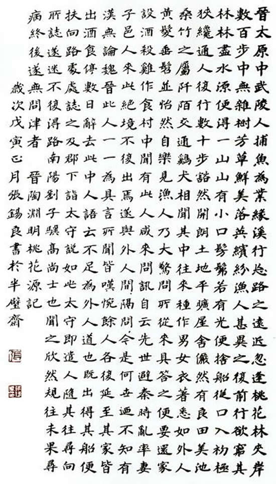 晉太元中,武陵人,捕魚(yú)為業(yè)。緣溪行,忘路之遠(yuǎn)近,忽逢桃花林。夾岸數(shù)百步,中無(wú)雜樹(shù),方草鮮美,落英繽紛。漁人甚異之,復(fù)前行,欲窮其林。林盡水源,便得一山。山有小口,仿佛若有光。便舍船從口入,初極狹,才通人。復(fù)行數(shù)十步,豁然開(kāi)朗。土地平曠,屋舍儼然,有良田美池桑竹之屬,阡陌交通,雞犬相聞。其中往來(lái)種作,男女衣著,悉如外人。黃發(fā)垂髫,并怡然自樂(lè)。見(jiàn)漁人,乃大驚,問(wèn)所從來(lái),具答之。便要還家,設(shè)酒殺雞作食。村中聞?dòng)写巳,咸?lái)問(wèn)訊。自云先世避秦時(shí)亂,率妻子邑人,來(lái)此絕境,不復(fù)出焉,遂與外人間隔。問(wèn)今是何世,乃不知有漢,無(wú)論魏晉。此人一一為具言所聞,皆嘆惋。馀人各復(fù)延至其家,皆出酒食。停數(shù)日,辭去。此中人語(yǔ)云:“不足為外人道也”。既出,得其船,便扶向路,處處志之。及郡下,詣太守說(shuō)如此。太守即遣人隨其往,尋向所志,遂迷,不復(fù)得路。南陽(yáng)劉子驥,高尚士也,聞之,欣然規(guī)往,末果,尋病終。后遂無(wú)問(wèn)津者。